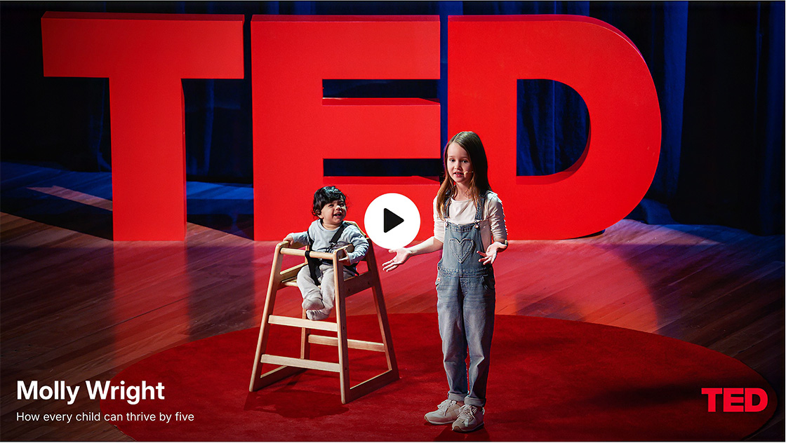 „What if I was to tell you that a game of peek-a-boo could change the world?“ asks seven-year-old Molly Wright, one of the youngest-ever TED speakers. Breaking down the research-backed ways parents and caregivers can support children’s healthy brain development, Wright highlights the benefits of play on lifelong learning, behavior and well-being, sharing effective strategies to help all kids thrive by the age of five. She’s joined onstage by one-year-old Ari and his dad, Amarjot, who help illustrate her big ideas about brain science. (This TED Talk was produced in collaboration with Minderoo Foundation as an educational tool for parents and caregivers around the world and is supported by UNICEF.)